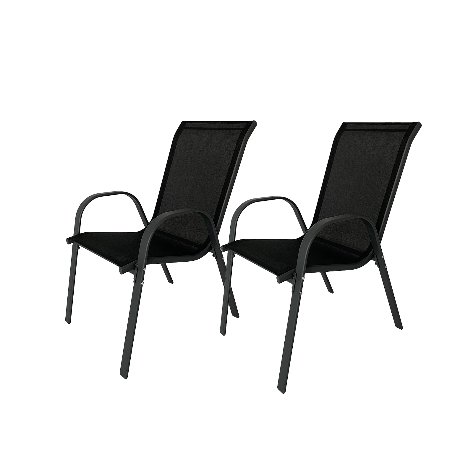 Crna baštenska stolica sa sjedalom i naslonom od tekstila i okvirom od čelika sa zaštitnim premazom. Tekstilen je udoban materijal postojanih boja koji se brzo suši i lako se čisti. Baštenske stolice se mogu složiti jedna na drugu za kompaktno skladištenje.