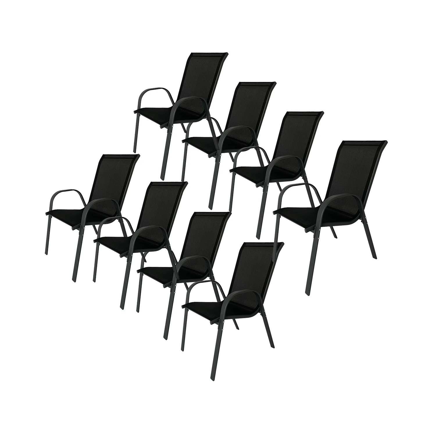 Crna baštenska stolica sa sjedalom i naslonom od tekstila i okvirom od čelika sa zaštitnim premazom. Tekstilen je udoban materijal postojanih boja koji se brzo suši i lako se čisti. Baštenske stolice se mogu složiti jedna na drugu za kompaktno skladištenje.