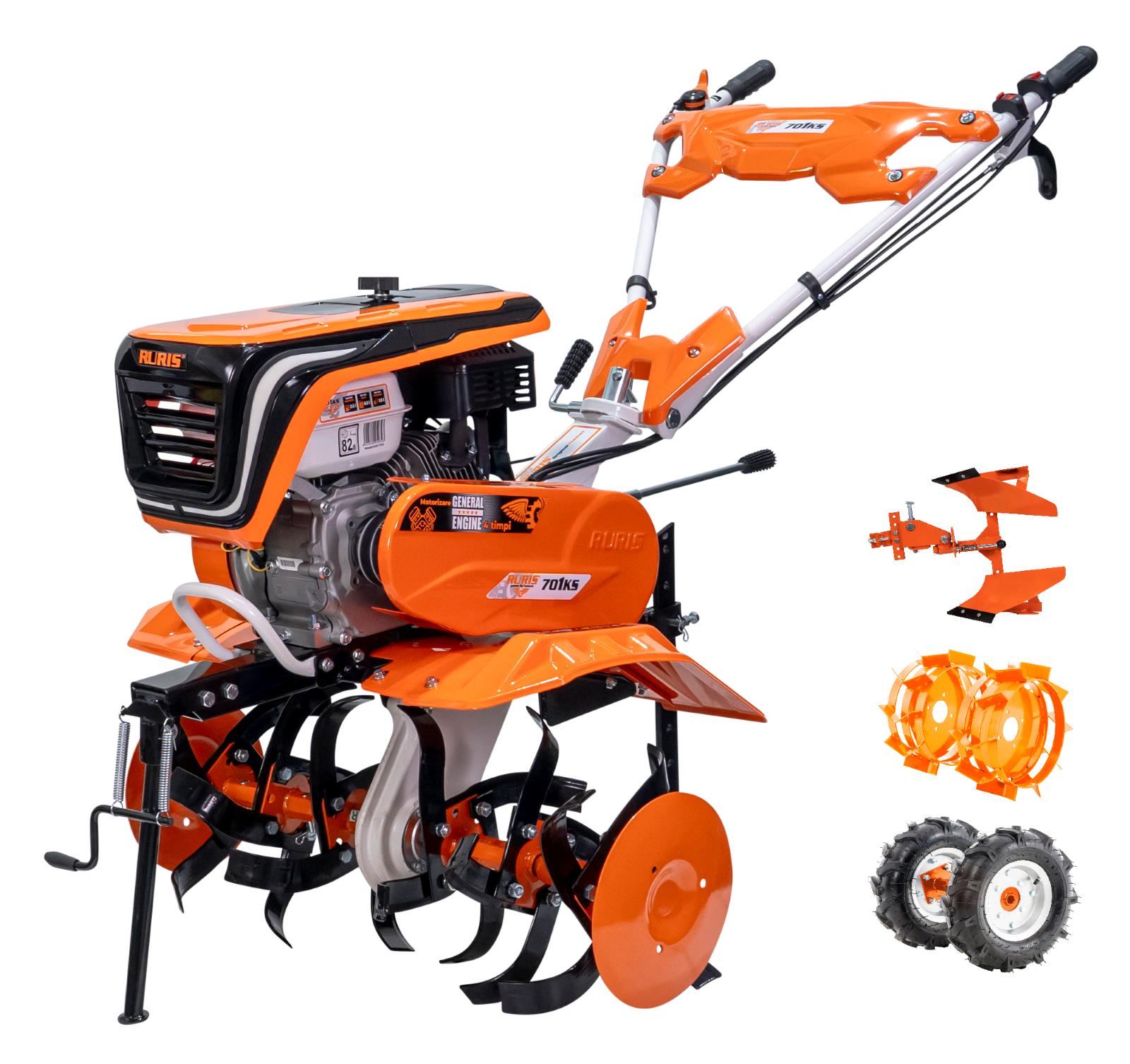 Ruris 701KS je profesionalna freza od 7KS i dolazi u setu sa gumenim točkovima 4.00-8, reverzibilnim plugom i metalnim točkovima.