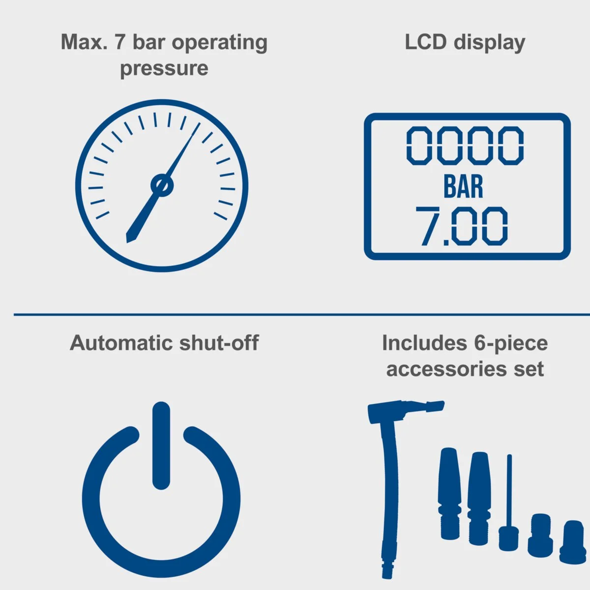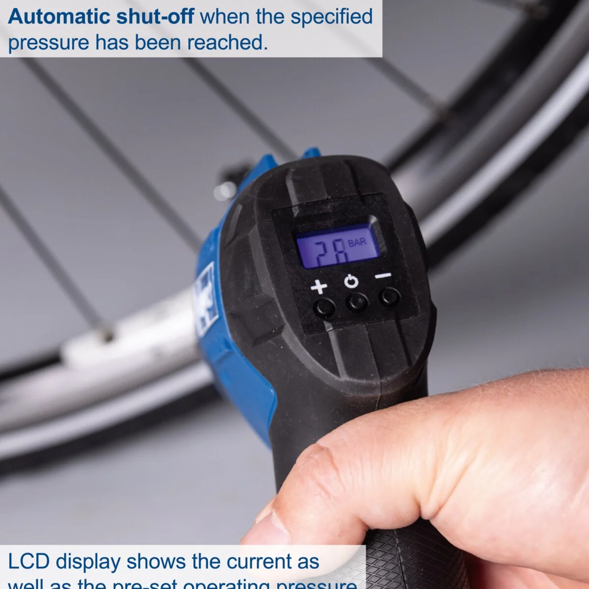 Automatsko isključivanje kada se dostigne unapred podešeni pritisak LCD ekran prikazuje trenutni i unapred podešeni radni pritisak u barima ili PSI |