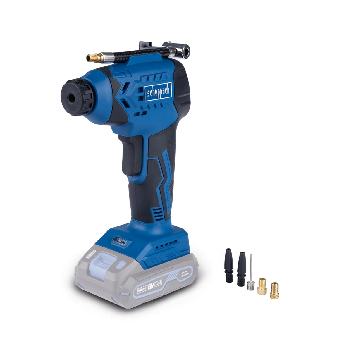 Sa maksimalnim radnim pritiskom od 7 bara, Scheppach akumulatorski ručni kompresor je praktičan, moćan pomoćnik u pokretu i idealan je za punjenje biciklističkih guma, lopti ili zračnih dušeka. LCD displej prikazuje trenutni i unapred podešeni radni pritisak u barima ili PSI. Kada se postigne podešeni pritisak, ručni kompresor se automatski isključuje (automatsko isključivanje). Kao dio Scheppach IXES 20-voltne serije, sve baterije i punjači iz serije sistema mogu se kombinovati sa kompresorom. .