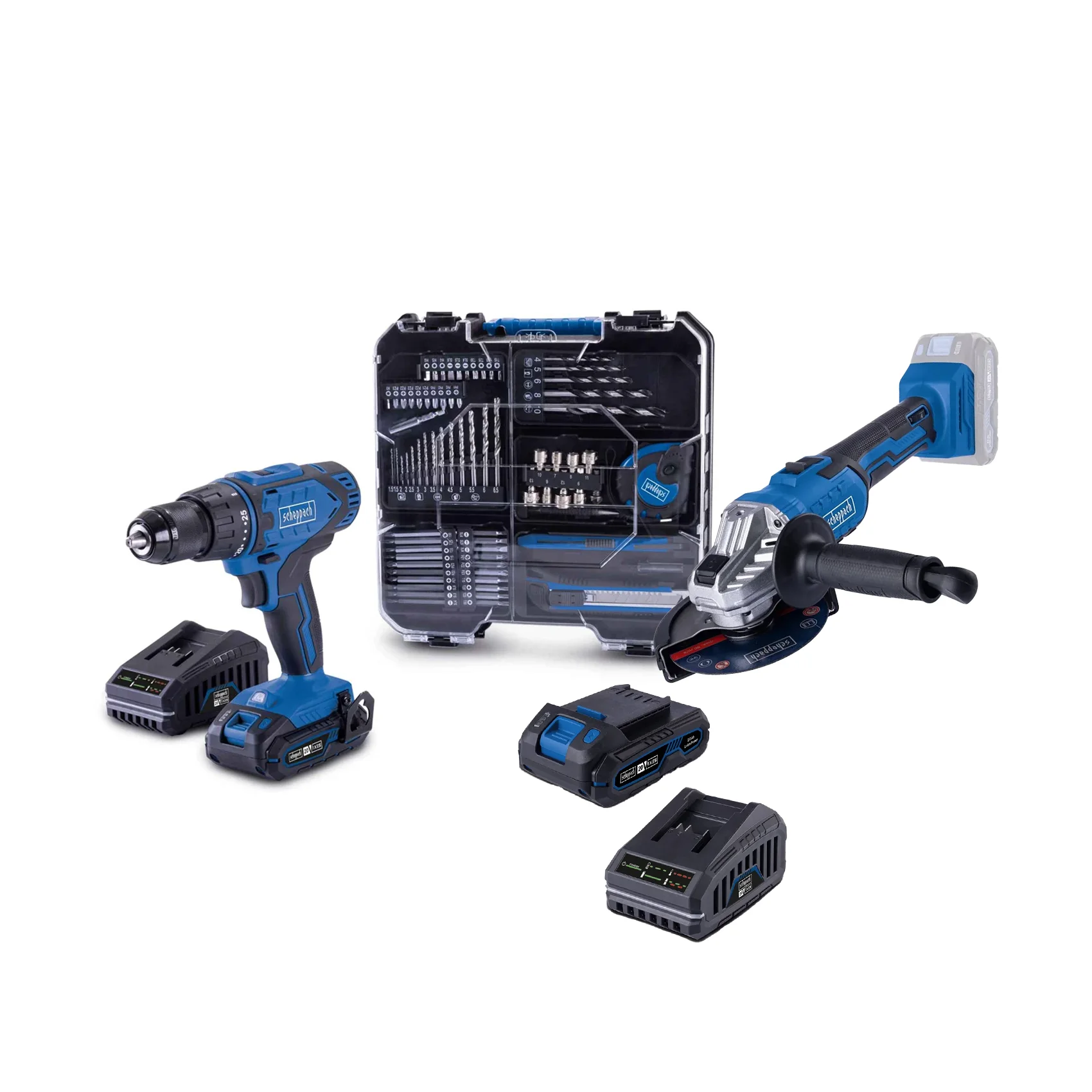 Set se sastoji od: Aku ugaona kutna brusilica IXES C-AG125-X – Solo Aku bušilica odvijač sa 74 komada pribora IXES C-DTB74/1-X – Kit 1 x IXES baterija 20 V 2 Ah 1 x IXES brzi punjač