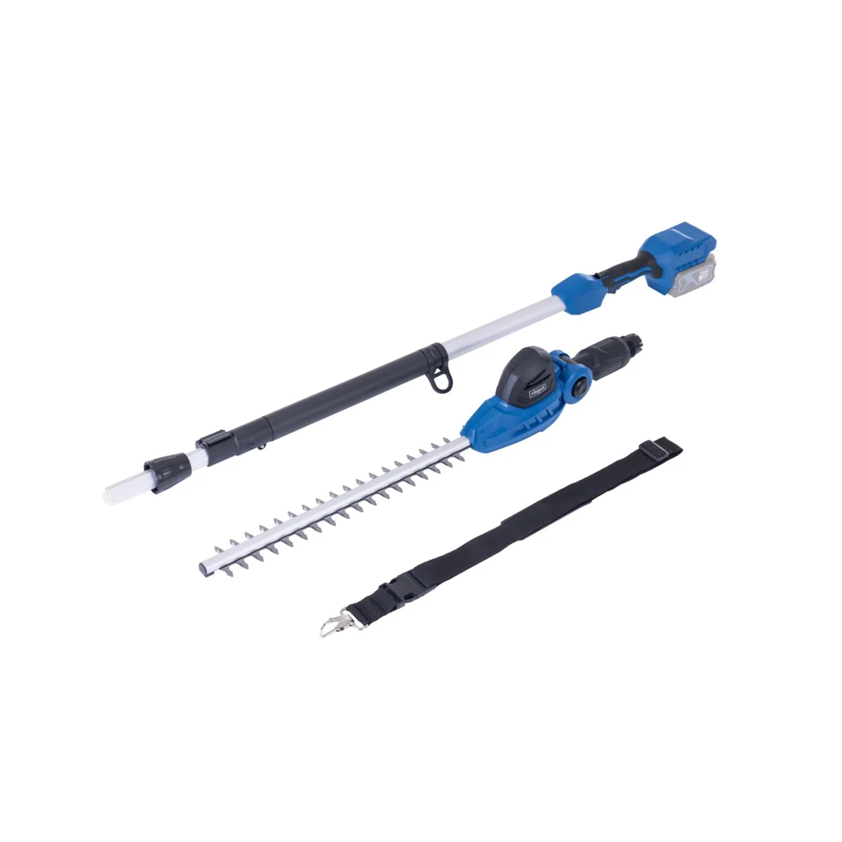 Može se zaključati pod različitim uglovima (90° – 240°)  Aluminijumska teleskopska šipka koja se podešava za maksimalnu visinu do 2.6 m Makaze za živu ogradu – dužina sečenja 410 mm Naramenica za dodatnu podršku i rad bez zamora Neklizajuća meka ručka sa sigurnosnim prekidačem Dugotrajni noževi od laserski rezani i dijamantski rezani čelik Solo model baterija i punjač ne dolaze
