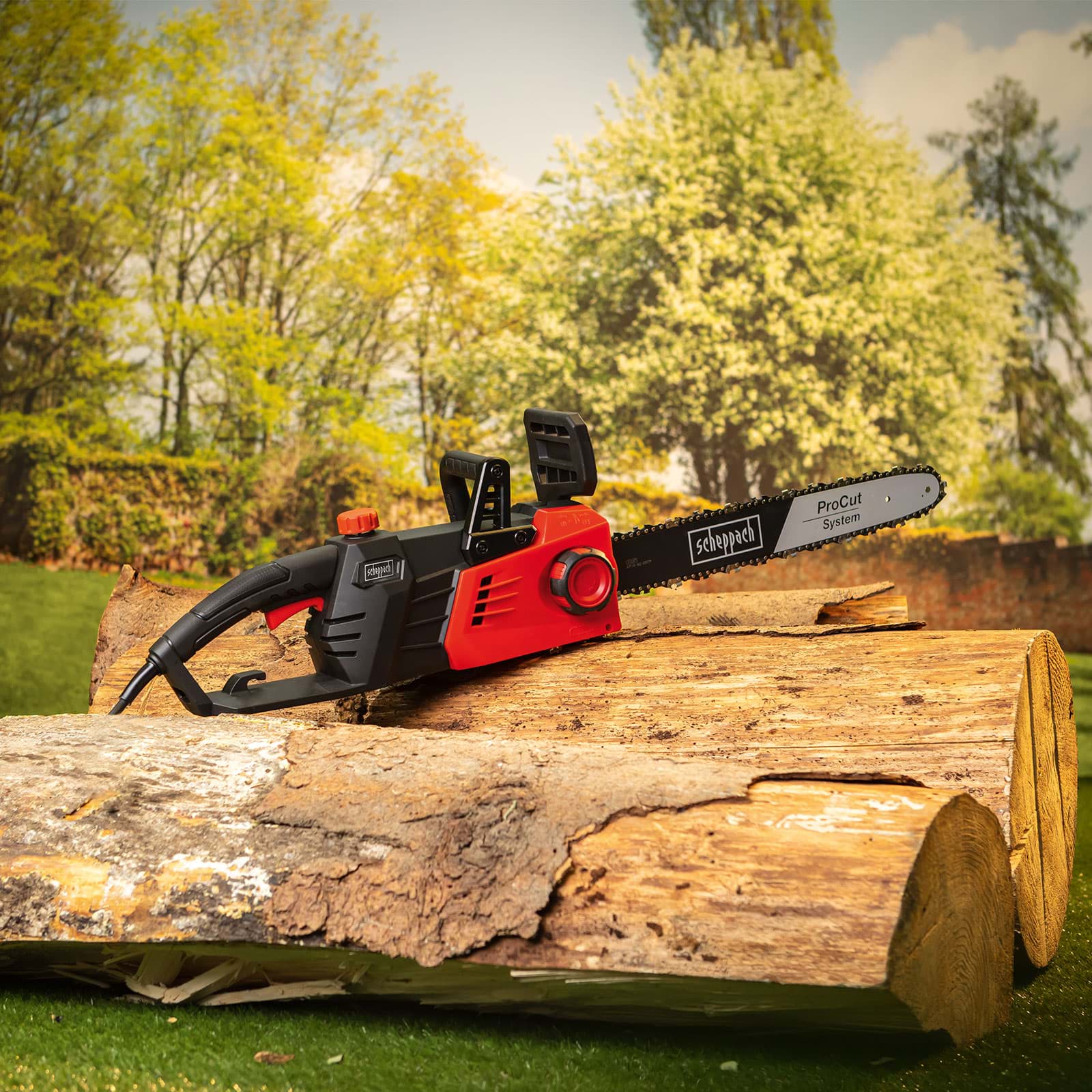 Snažni električni motor od 2700 W i visokokvalitetni ProCut mač i lanac od 18″ ili 45,5 cm čine motornu pilu scheppach CSE2700 idealnim alatom za piljenje u kući: za prorjeđivanje i rezanje stabala i uklanjanje grmlja i živica ili za piljenje drva za ogrjev. S debljinom rezanja od 44 cm, deblje grane ili čak stabla nisu problem.