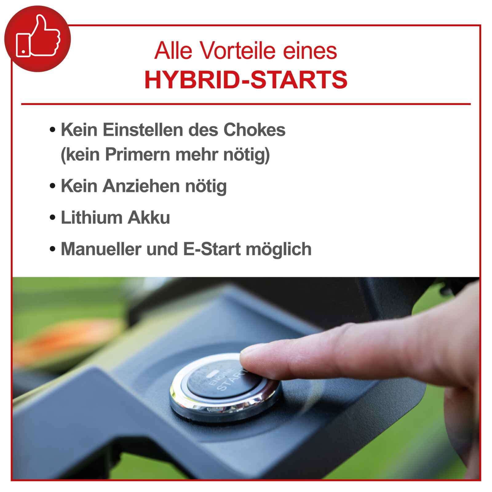 Za pokretanje mašine nije potreban nikakav fizički napor. Ugrađena litijumska baterija omogućava lako električno pokretanje motora. Nema podešavanja prigušivača niti povlačenja startnog kabla. Samo izvucite kosilicu i počnite sa radom. Alternativno, klasično pokretanje povlačenjem kabla je i dalje moguće.