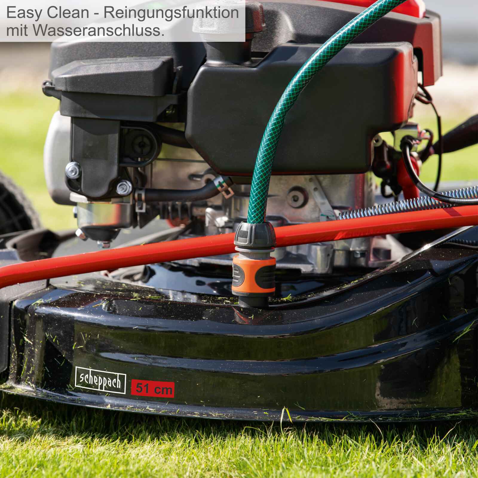 Prljavština iz čeličnog kućišta uklanja se veoma brzo. Za to služi praktična funkcija čišćenja sa priključkom za vodu. Nakon rada, ručka se dvaput preklapa i kosilica se odlaže uz maksimalnu uštedu prostora. Ovakav dizajn znatno olakšava i njen transport.