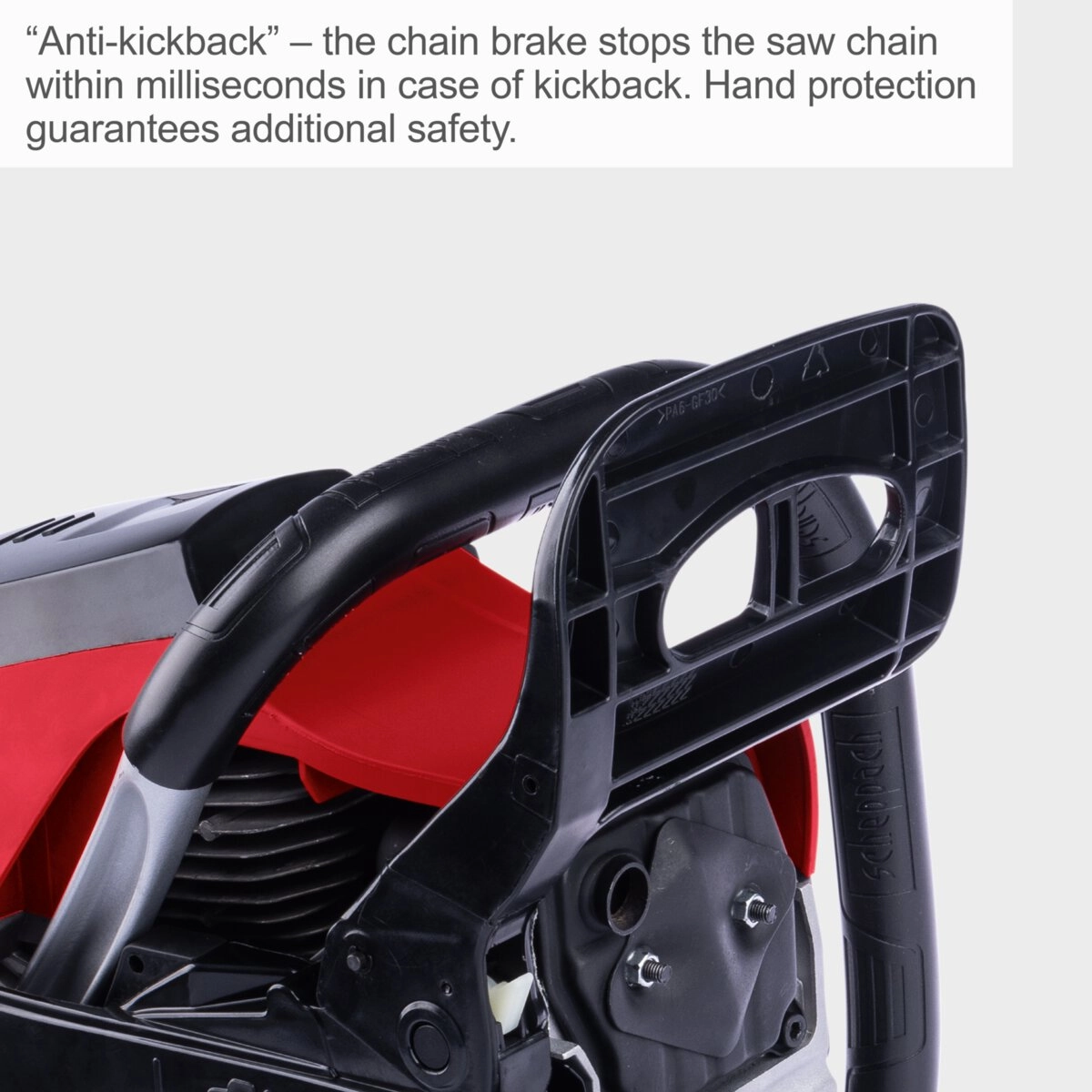 - Anti-Kickback – kočnica lanca zaustavlja lanac unutar nekoliko milisekundi u slučaju povratnog udara