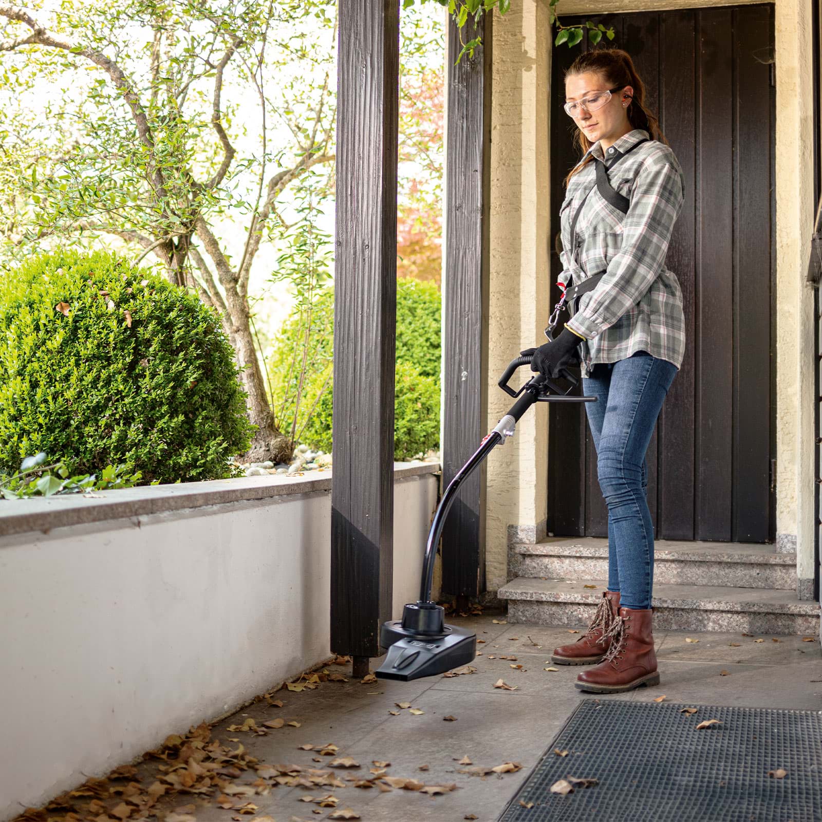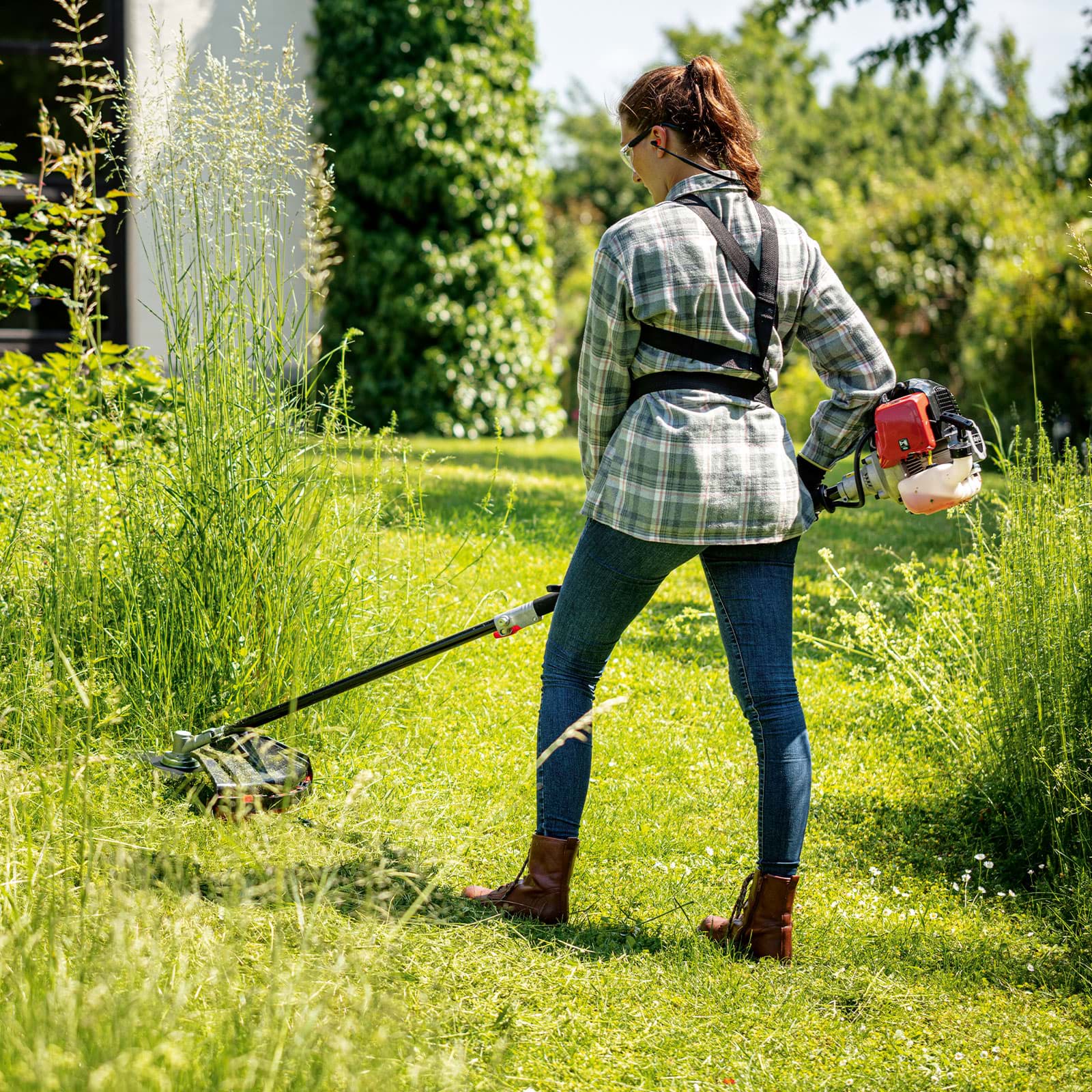 Trimer za travu ima maksimalnu širinu rezanja od 450 mm i osigurava čist rez pri rezanju rubova travnjaka i manjih površina. Na dvostrukom kalemu konca dostupno je ukupno 4 m konca. Integrirano automatsko narezivanje, sa kojim se istrošeni konac može produljiti lupkanjem po tlu dok stroj radi, olakšava rad.