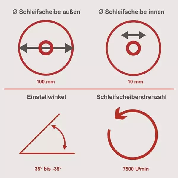 100 x 10 mm brusni točak Debljina brusnog točka: 3.2 mm Štitinik od varnica Ugao brušenja -35 ° do 35 ° |