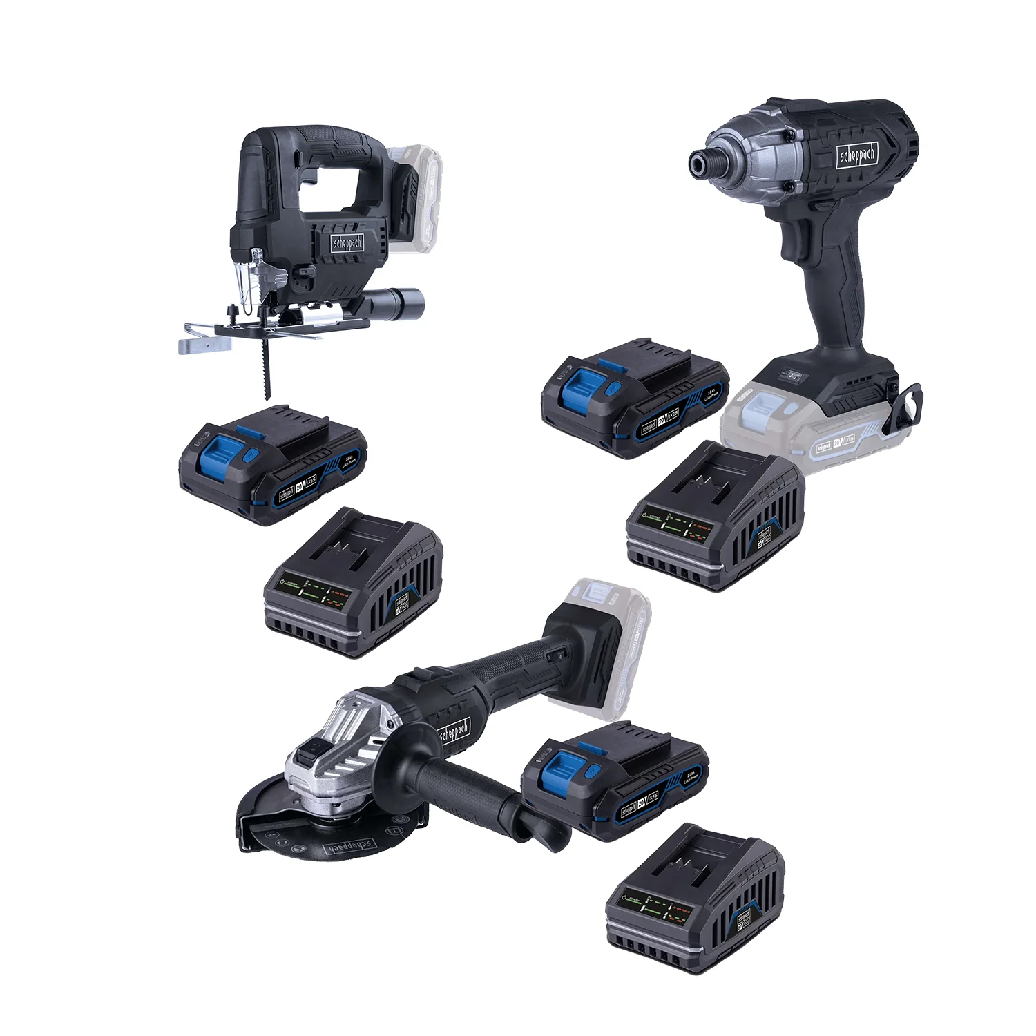 Scheppach ugaona brusilica, odvijač i ubodna pila Black Edition AKU SET 1