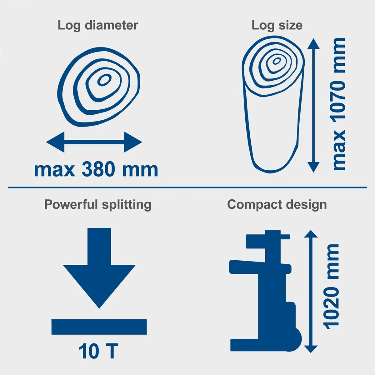 Sa kapacitetom od 10 tona, klin za cijepanje Scheppach Compact 10t cijepa trupce dužine do 1070 mm i maksimalnog prečnika od 380 mm. Sigurnosni nosač i rad s dvije ruke osiguravaju optimalne sigurnosne uslove.