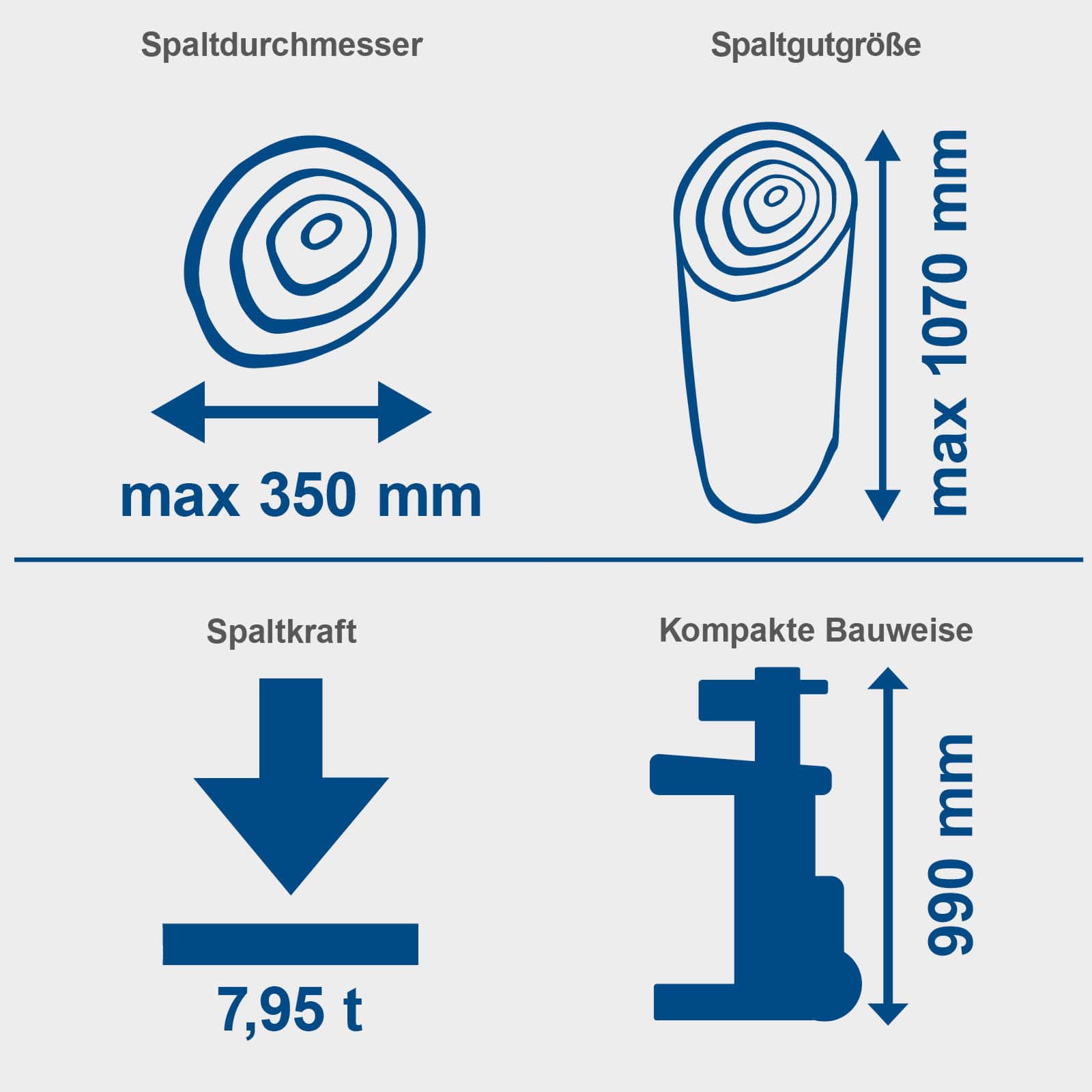 Sa težinom od 7,95 tona, klin za cjepanje 160 x 70 mm scheppach Compact 8t cjepa trupce dužine do 1070 mm i maksimalnog prečnika od 350 mm. Cjepač trupaca bez napora obrađuje tvrdo i meko drvo i zahtjeva samo normalnu utičnicu od 230 V. Sigurnosni nosač i rad sa dvije ruke obezbjeđuju optimalne bezbijednosne uslove.
